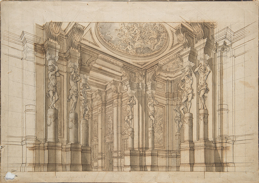 18th-century artist "Architectural study with columns" pen, brown and gray inks, over traces in black chalk (mm 350x490) (defects)