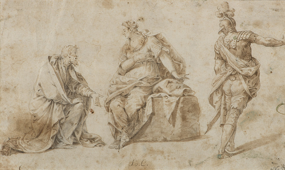 Scuola italiana, fine secolo XVII. Disegno raffigurante tre personaggi di cui...