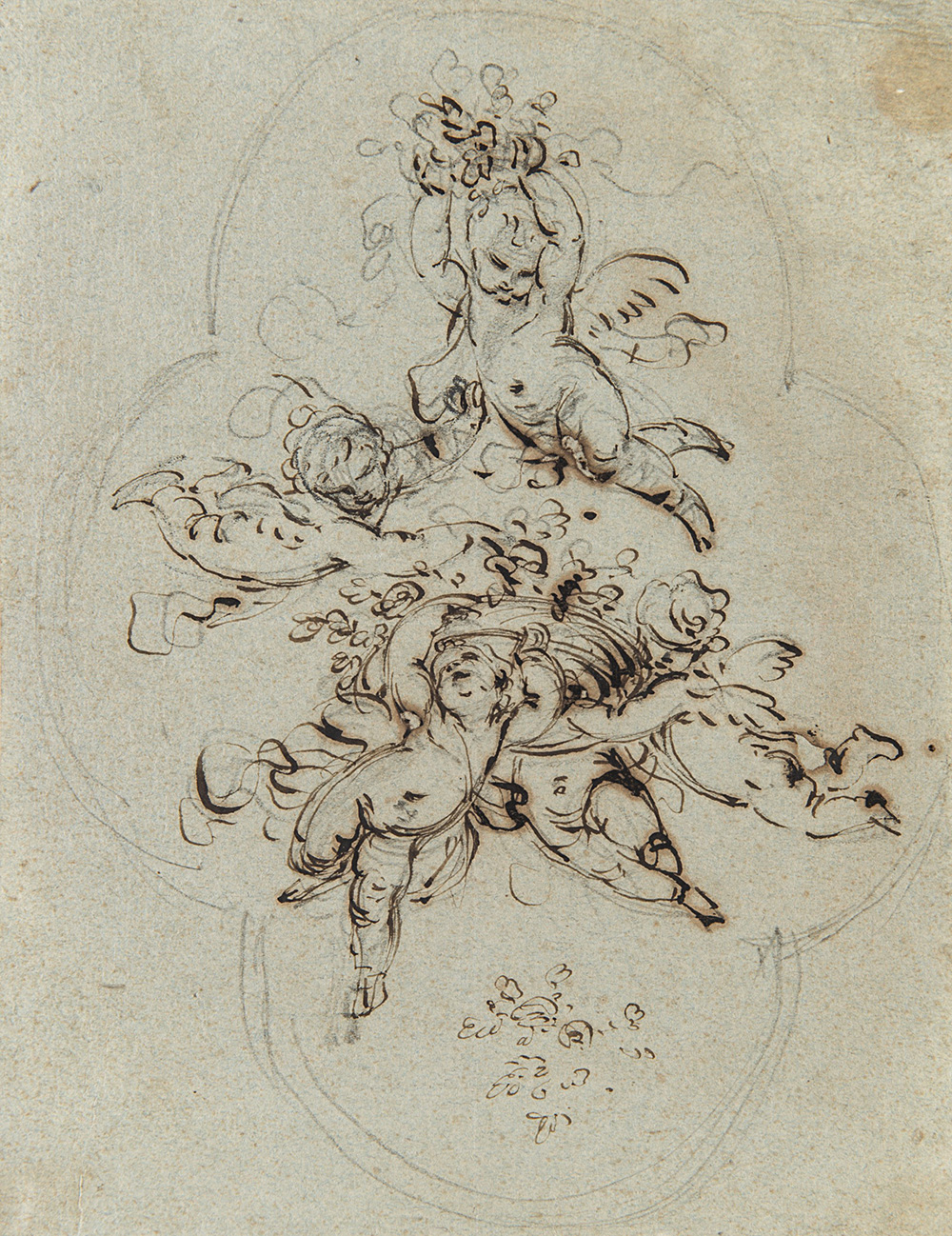 "Cherubs with flowers" black chalk, pen and brown ink on blue paper (mm 200x154) (defects)