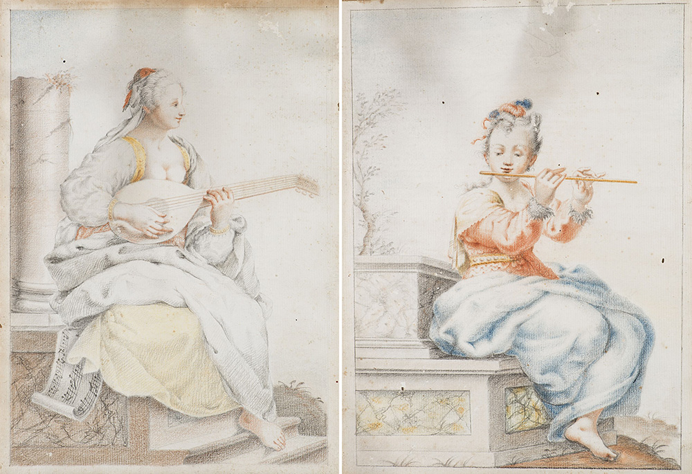 Artista del secolo XVIII. Due disegni raffiguranti donne con strumenti musicali, pastelli su carta vergellata (mm 310x220 circa) In cornice (difetti)