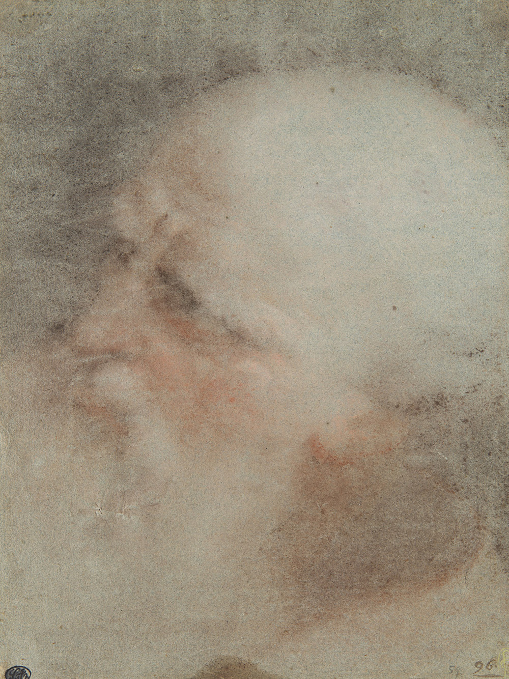 Barocci school "Head of a man" drawing in black chalk and pigments on paper (mm 276x208) (defects)