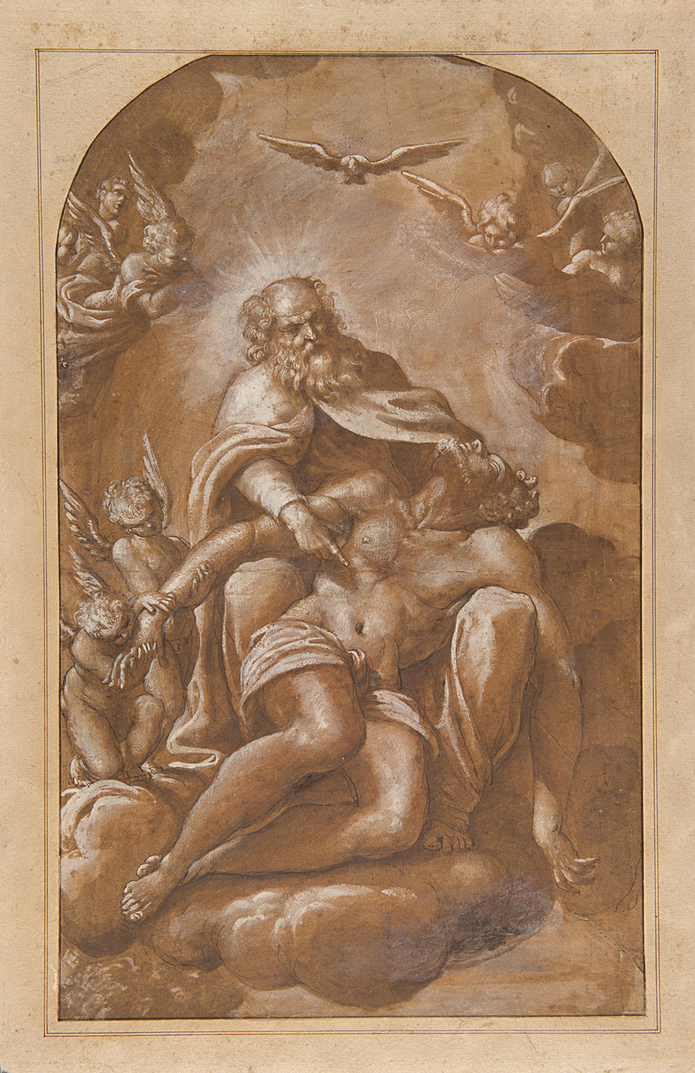 Early 17th-century Bolognese school "Trinity" pen and brown ink washed brown, heightened in white on brown paper, top of the sheet arch-shaped (mm 450x275) (defects and restorations, applied)