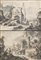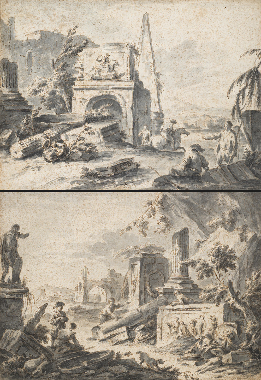 Scuola veneta del secolo XVIII "Capricci con rovine" due disegni a penna e inchiostro bruno acquerellato in grigio (mm 300x400 circa) in cornice (difetti)