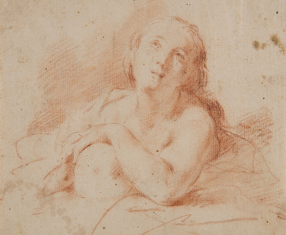 Artista del nord Italia, secolo XVII "Maddalena" sanguigna su carta (mm 158x193) Filigrana: stella in un cerchio sormontato da croce. Inscritto "di Francesco Cairo" al verso (difetti)