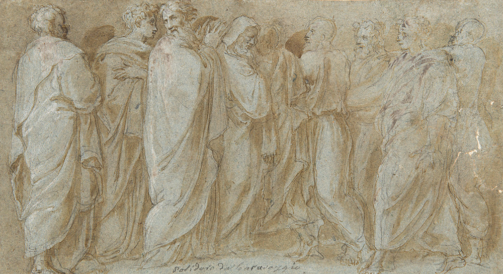 Da Polidoro da Caravaggio "Figure virili panneggiate" penna inchiostro bruno, acquarellato in bruno, tocchi di biacca su tracce a matita nera, carta azzurrina, iscritto a matita Polidoro da Caravaggio (mm 149x270) (difetti, controfondato)