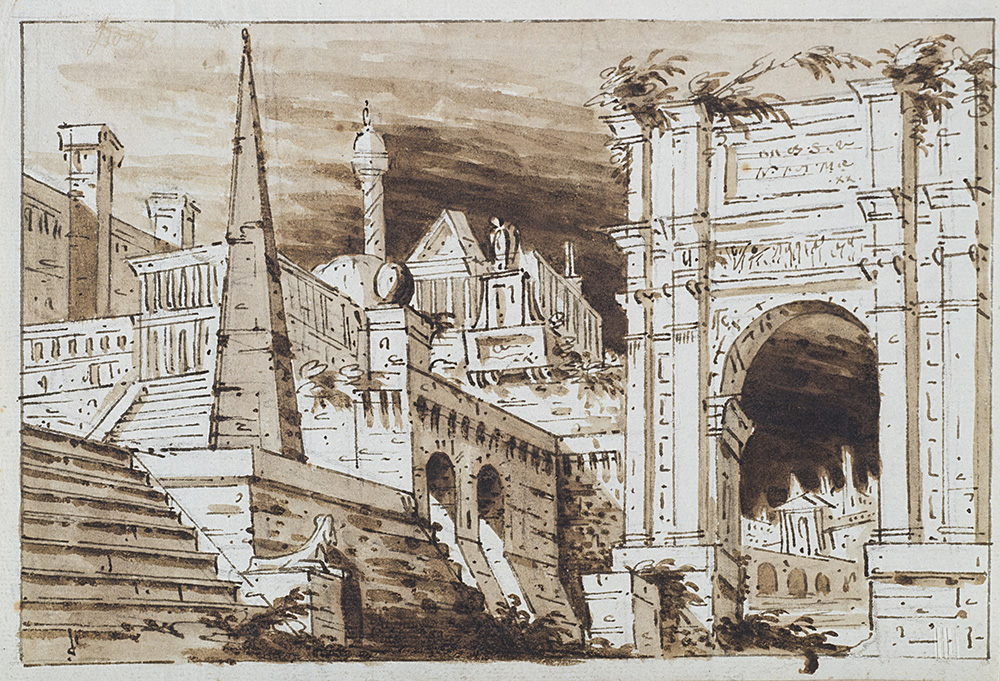 (attributed) "Stage set drawing: Roman ruins, staircase and obelisk" pen and brown ink washed brown on traces in black chalk (mm 128x183) framed.