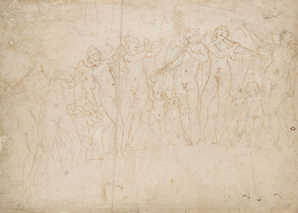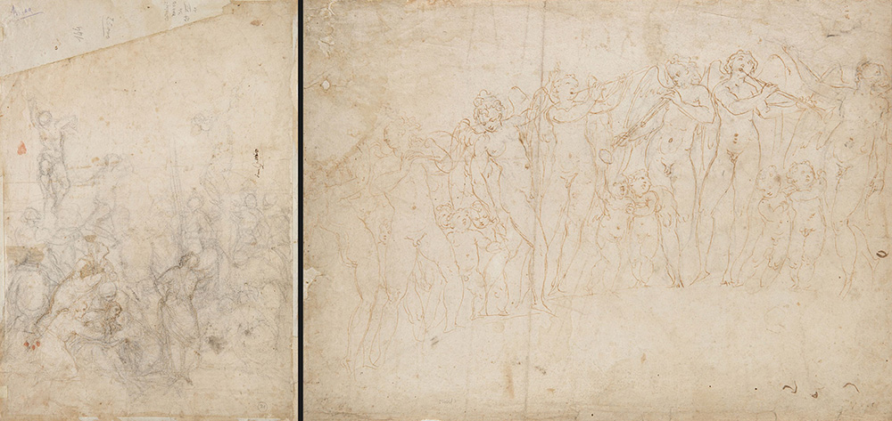 16th-century Italian school, "Cherubs" (recto); The crucifixion (verso)" pen, brown ink and black chalk (mm 280x385) with inscription "Gatti" (defects)