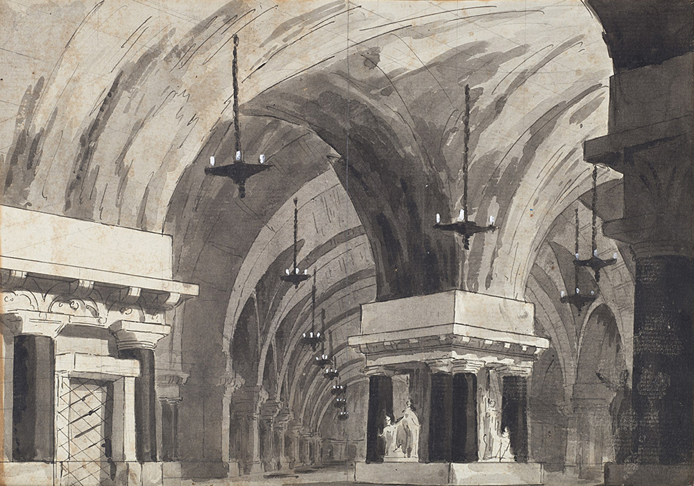 (attr.)"Scenografia" al retro etichetta che l'attribuisce a "Vendetta e dell'Odio / Sotterraneo scavato dai Mori" penna e inchiostro nero acquerellato in nero e grigio su tracce a matita (mm 214x303) In cornice (difetti)