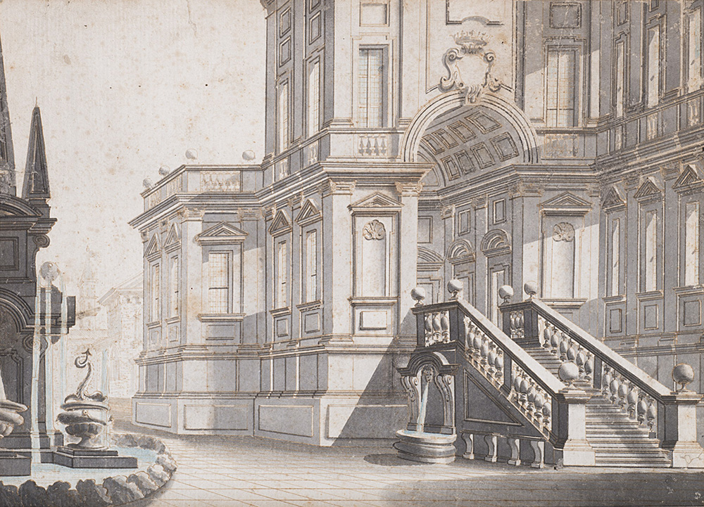 Anonymous stage set designer, late 18th century "Palace courtyard with staircase and balustrade" pen and brown ink, washed gray and blue over traces in black chalk (mm 223x310) framed (defects)