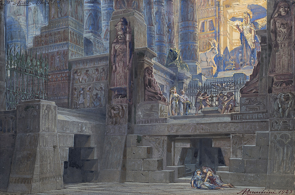 "Scenografia egizia" penna, acquerelli con tocchi di biacca, tracce di matita (mm 297x445) In cornice. Firmato "A. Parravicini 1923"