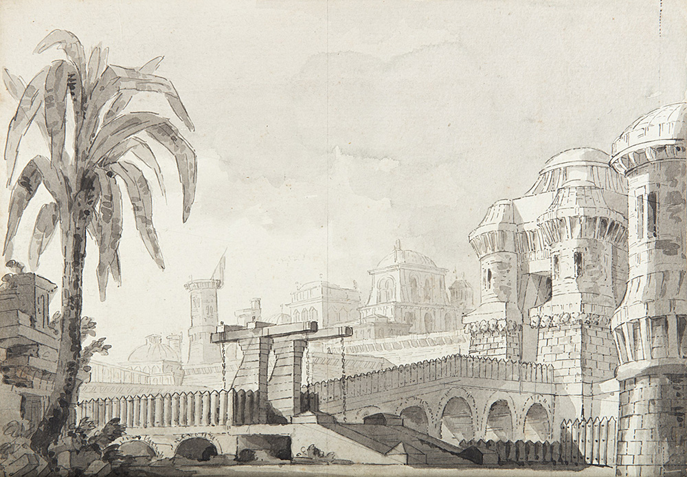 Anonymous stage set designer, 19th century "Citta di Cirta" pen and brown ink washed brown over traces of black chalk (mm 210x300) framed