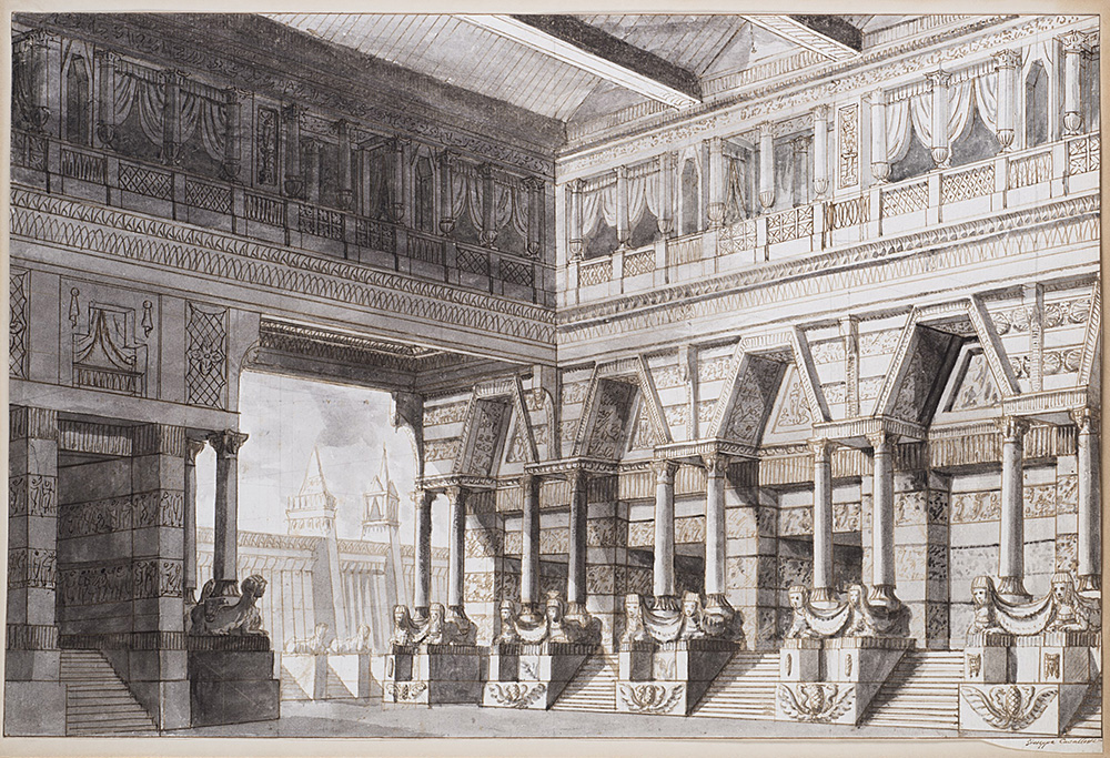"Stage set design with Egyptian sphinxes" pen, brown ink and wash, over traces in black chalk (mm 325x490) Signed lower right. Framed