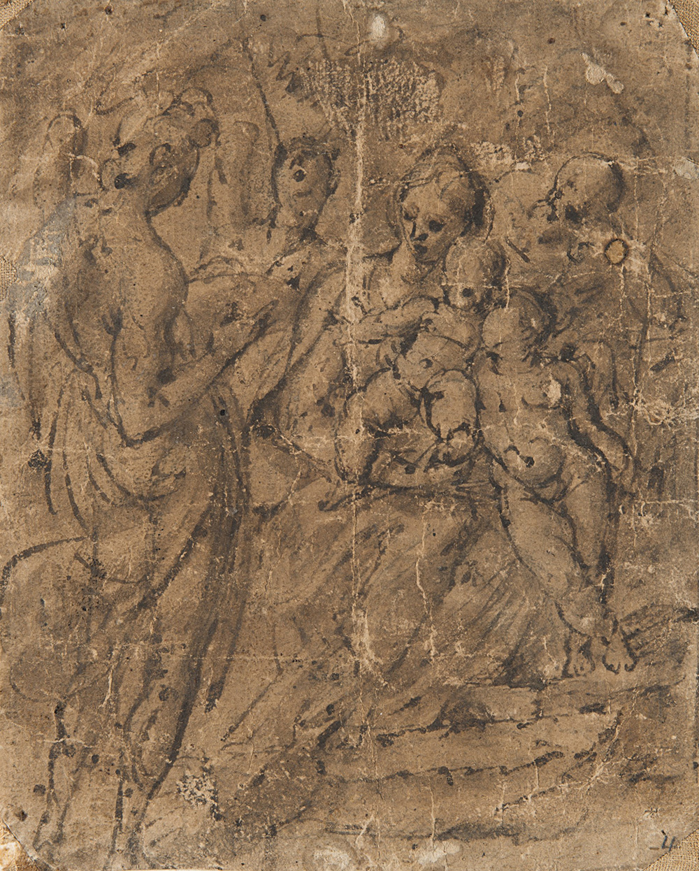 Prague school, late 16th-century "The Holy Family with Saint John and Saints" brush with brown ink washed brown on brown paper (mm 183x146) Inscribed in pencil "Parmigianino" on verso (major defects)