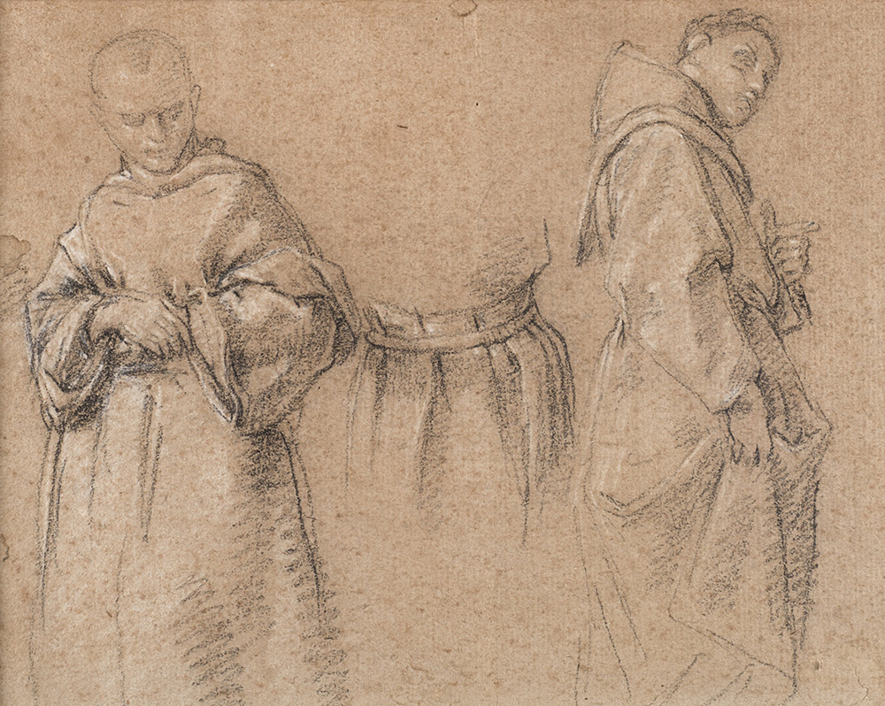 detto Poccetti (attr.) "Studi per figure di Monaci" carboncino e rialzi a gessetto bianco su carta nocciola (mm 290x350) In cornice (difetti)