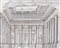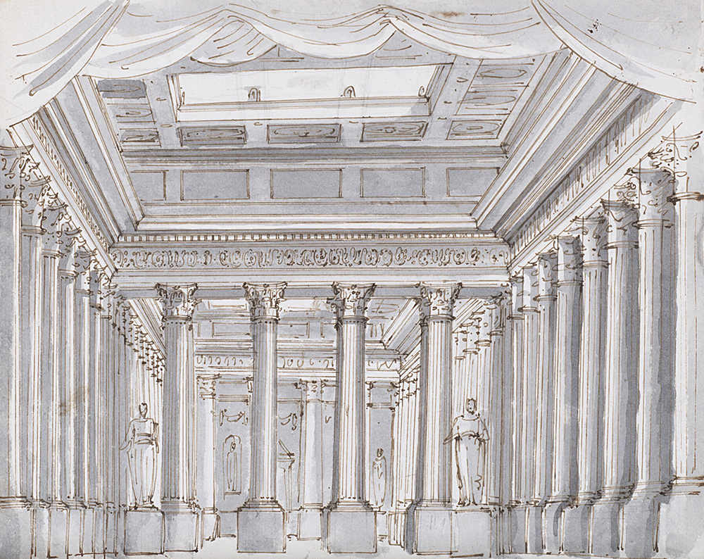 (attr.) "Scenografia riferita all'opera Belisario" penna e inchiostro bruno acquerellato in grigio, tracce a matita nera (mm 206x257) In cornice. Al verso iscrizione "Belisario/atto I scena II/Sala del Consiglio (...)" e schizzi architettonici a matita nera