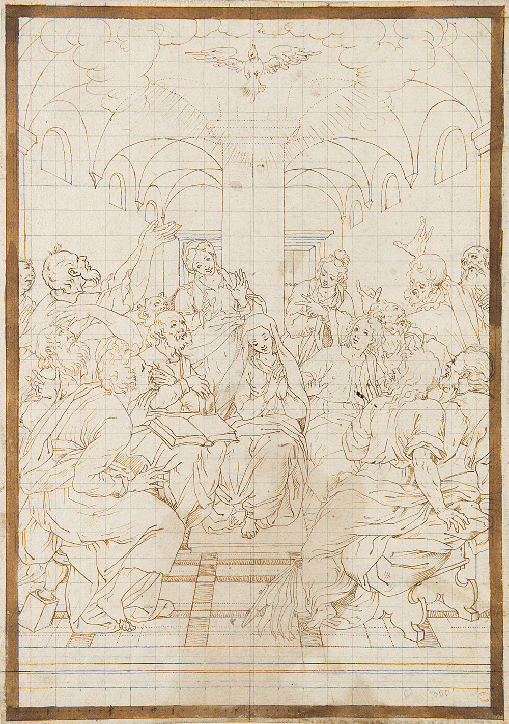 detto il Chiaveghino "La discesa dello Spirito Santo" penna inchiostro, quadrettato (mm 360x253) (difetti)