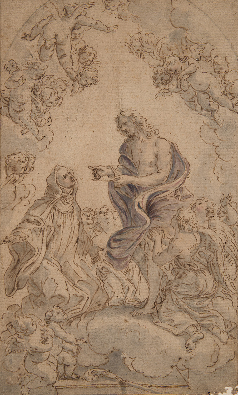 detto il Baciccia "Cristo in comunione con una santa" penna e inchiostro bruno, acquerello e tracce di matita nera (mm 374x227)con iscrizione "A.A. Coreggio" sul retro della montatura (difetti)