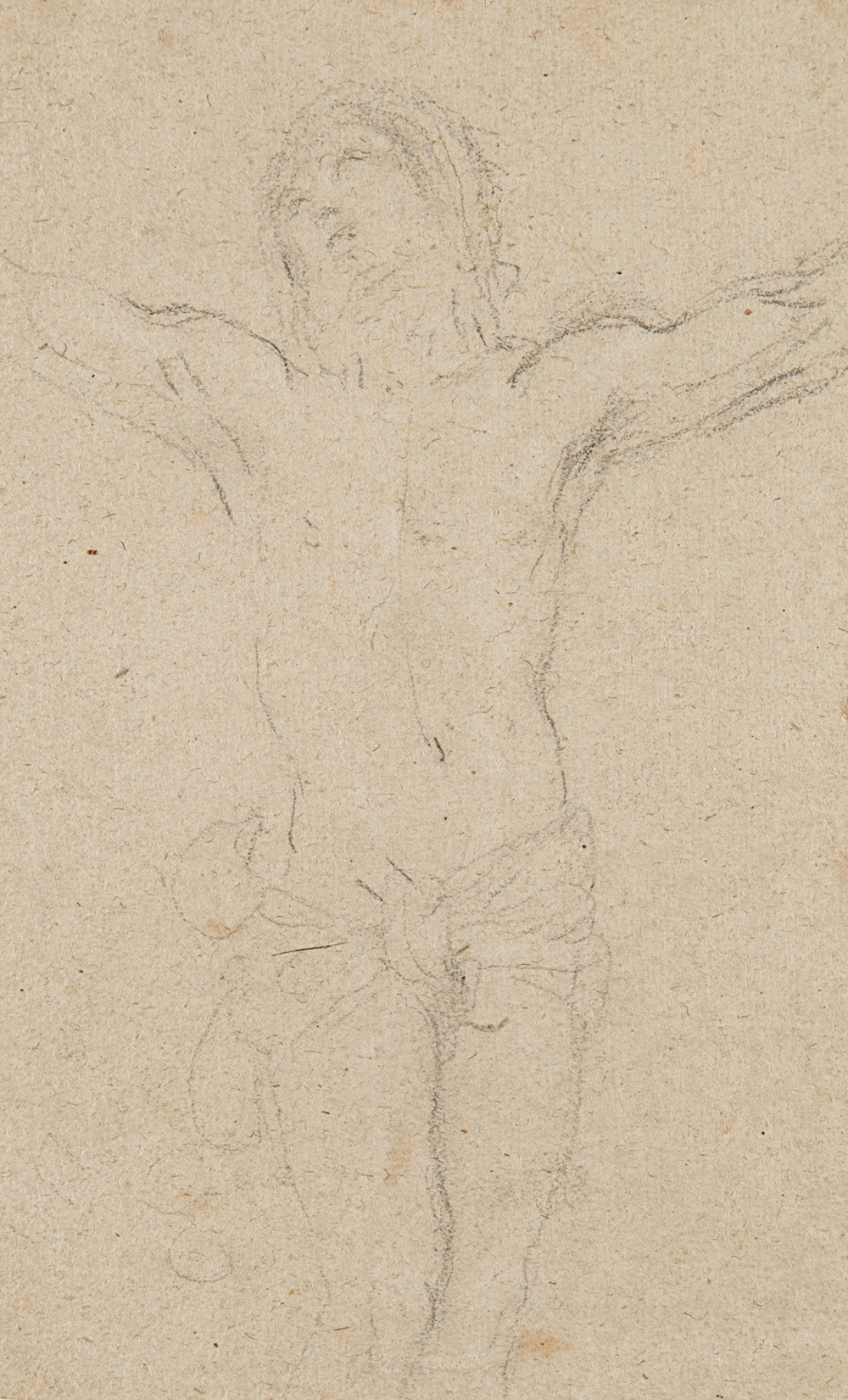 17th-century Emilian school "Christ Crucified" black chalk on brownish grey paper (mm 205x126) Antique attribution to Guido Reni on verso
