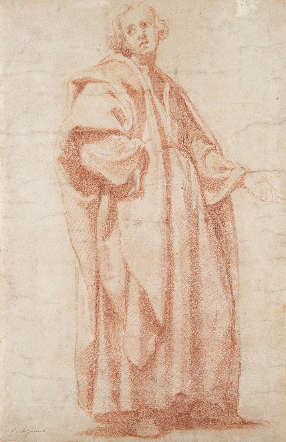 Late 16th-century Florentine school "A standing draped figure" red chalk (mm 405x250) with inscription "Passignano" Indistinct watermark (defects)