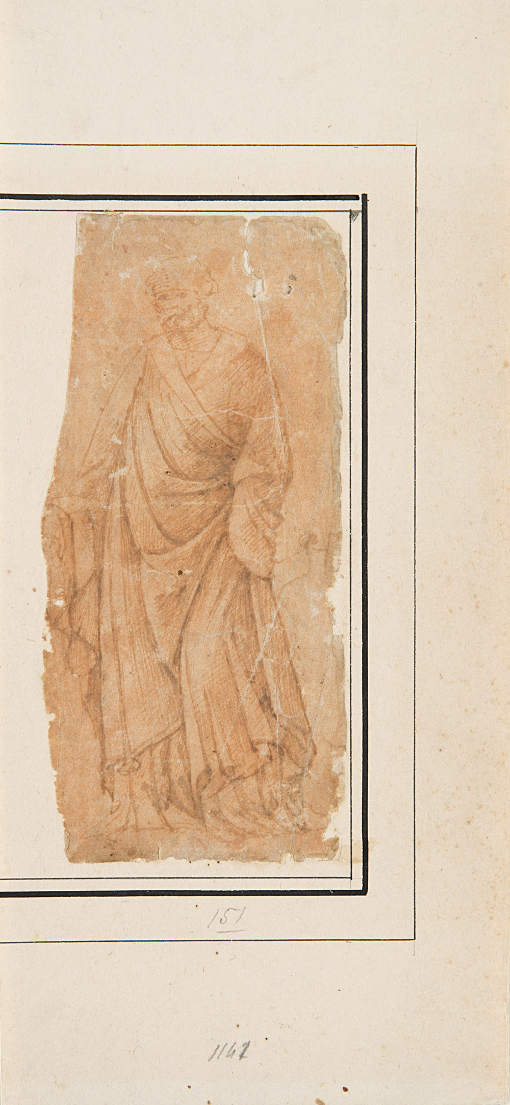 15th-century artist "Male standing figure" brown wash, red chalk on paper (mm 172x80 irregular) (defects)