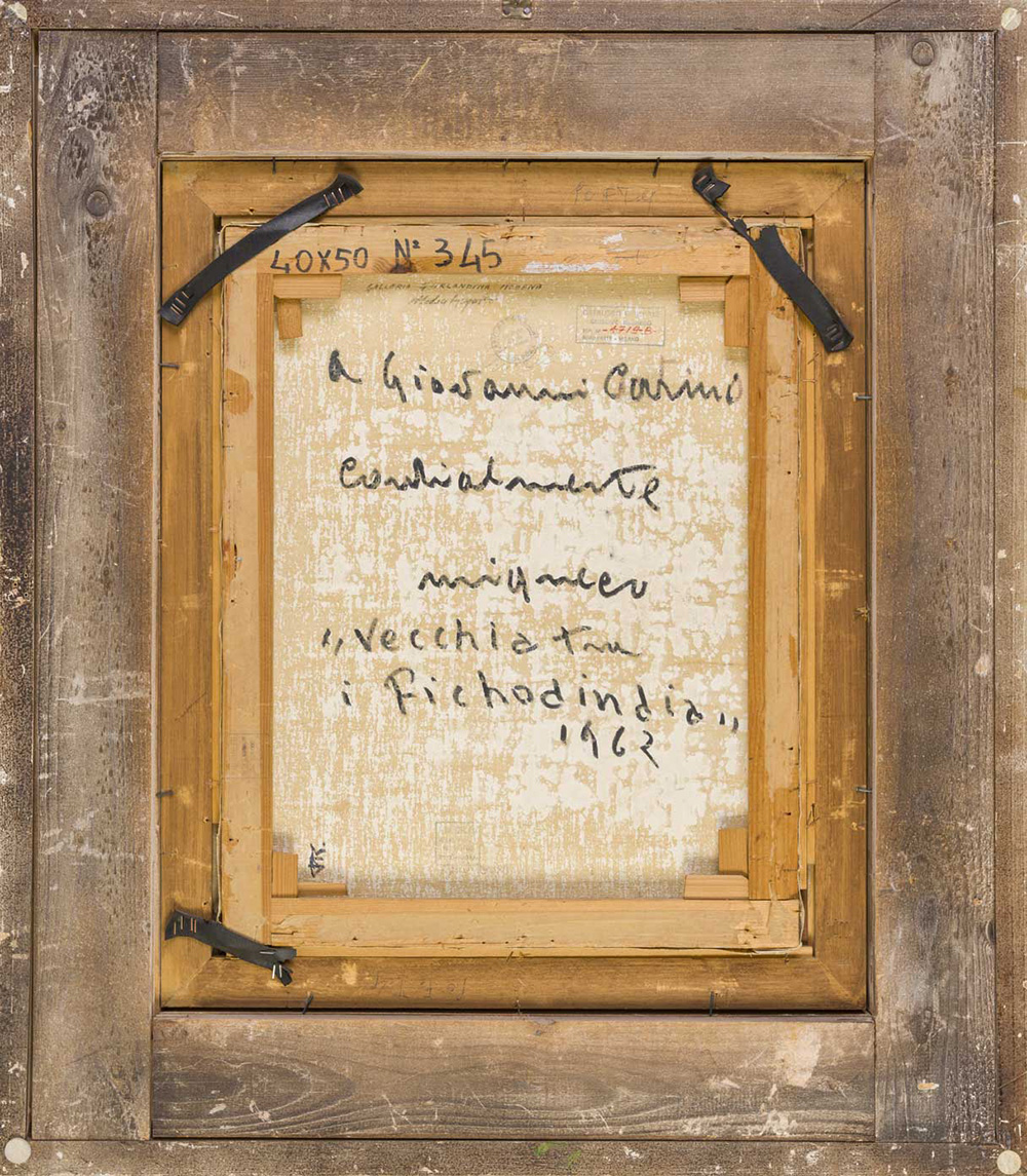 GIUSEPPE MIGNECO (1908 - 1997) Vecchia tra i fichi d'india 1962 Olio su tela 50 x 40 cm Firmato in basso a destra Dedica, firma, titolo e data al retro Opera archiviata presso l'Archivio Catalogo Generale G. Migneco con il n. 4719 - B PROVENIENZA: Galleria Mario Marescalchi, Bologna (timbro al retro) Galleria Ghirlandina, Modena (iscrizione al retro) Galleria d'arte F.lli Orler, Favaro Veneto (timbro) Collezione privata, Milano