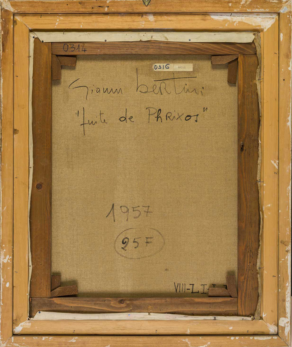 GIANNI BERTINI (1922 - 2010) Fuga di Friso 1957 Olio su tela 81 x 65 cm Firmato in basso a destra Firma, titolo, data, n. invetario e data in numeri romani al retro Autentica su foto firmata dall'artista a cura dello Studio Santandrea PROVENIENZA: Studio Santandrea, Milano Collezione Giuseppe Albini, Milano Collezione privata, Milano BIBLIOGRAFIA: G. Ballo, 'Gianni Bertini', Giampaolo Prearo Editore, Milano, 1971, pp. 45, 173 (ill.)