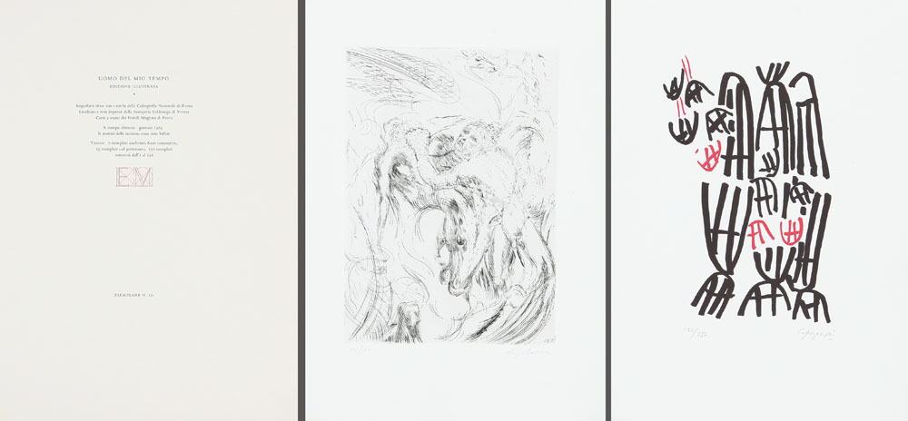 AUTORI VARI Uomo del mio tempo volume completo contenente incisioni all'acquaforte di Giuseppe Ajmone; Gastone Breddo; Domenico Cantatore; Giuseppe Capogrossi;Franco Gentilini; Virgilio Guidi; Bruno Saetti; Aligi Sassu; Renzo Sommaruga, tutte firmate; tirate con i torchi della Calcografia Nazionale di Roma Linoleum e testi impressi dalla Stamperia Valdonega di Verona Carta a mano dei Fratelli Magnani di Pescia, a stampa ultimata nel gennaio 1963 le matrici delle incisioni sono state biffate. Tiratura: 7 esemplari antilettera fuori commercio, 13 esemplari "ad personam", 150 esemplari numerati dall'1 al 150. Esemplare numero 121; cm. 46,7x32,2. Pubblicata sul catalogo "I Libri D'Artista Italiani del Novecento" a cura di Ralph Jentsch, Umberto Allemandi & C., pagina 80.