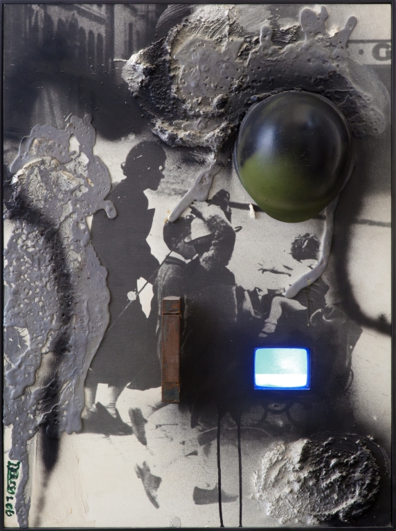 mixed media with television set on photo on panel 44,09x32,28x14,56 in