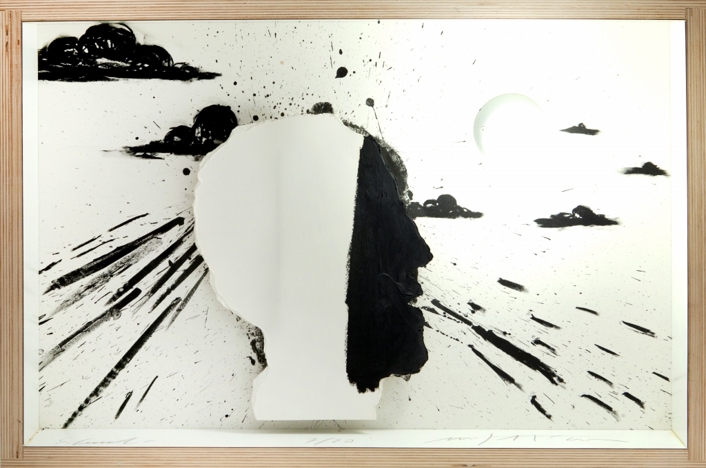tecnica mista e lampada su cartone in box di legno cm 43x63x16