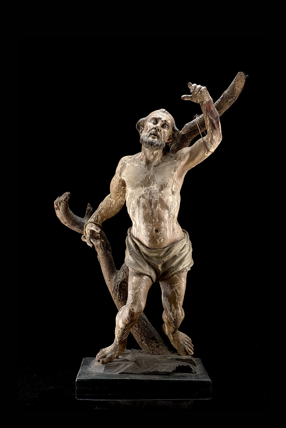 Early 18th-century Italian artist "St. Bartholomew the Apostle" polychrome wooden sculpture (h. cm 72) (restorations and losses)