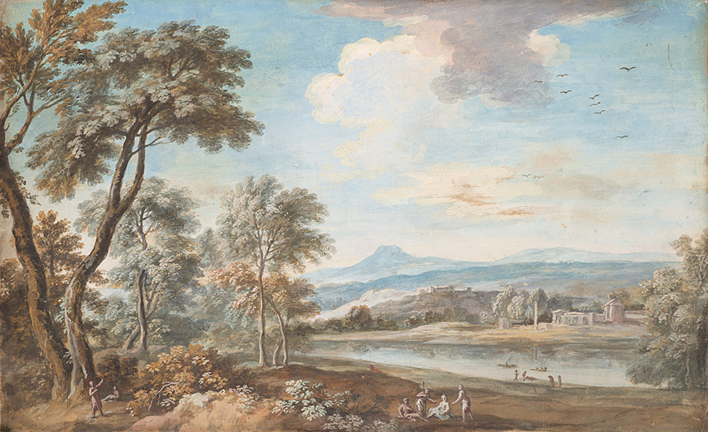 Scuola veneta del secolo XVIIIPaesaggio fluviale con viandantitempera su...
