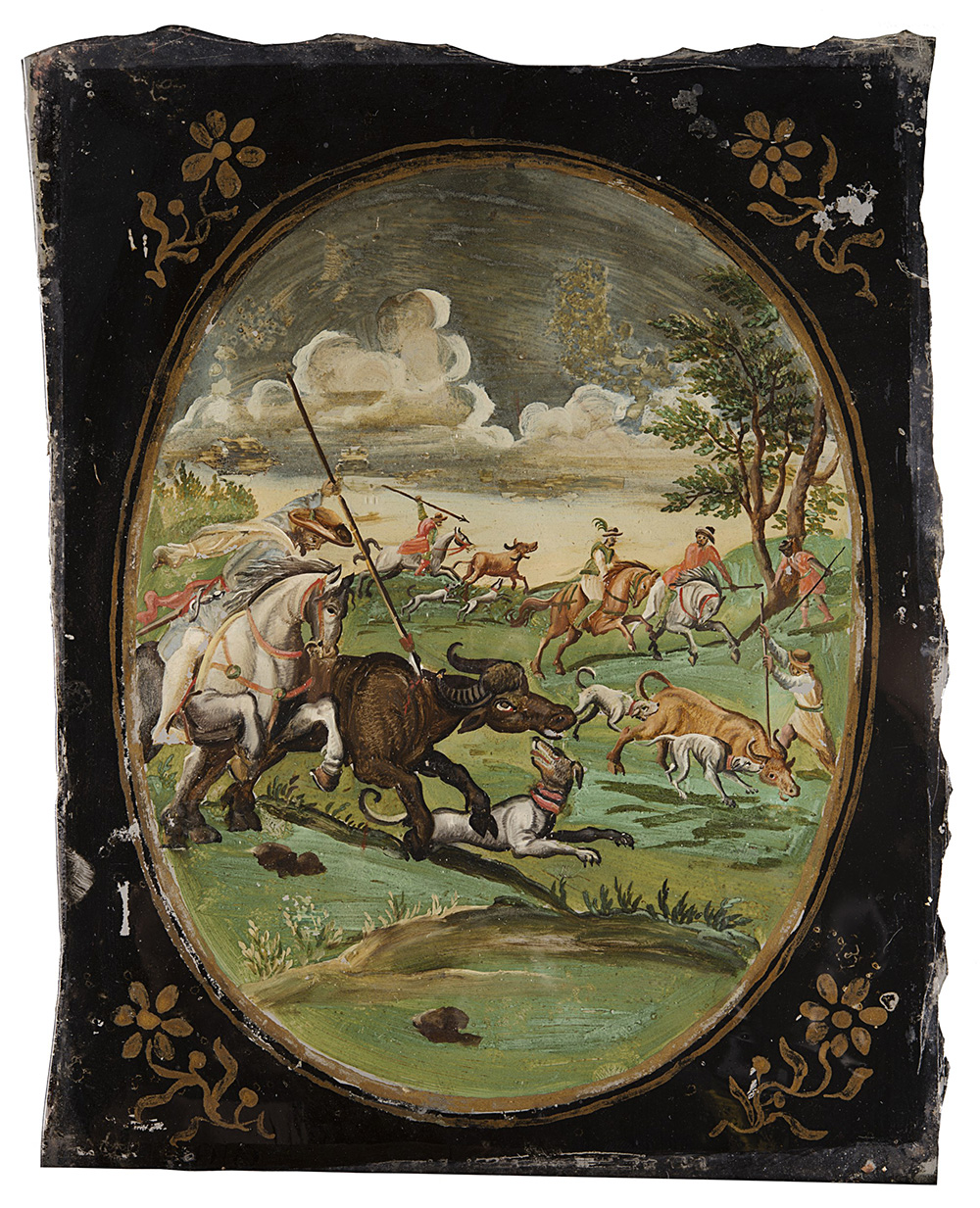 Scuola indo-portoghese del secolo XVIII "Scena di caccia al bufalo" verre peint (cm 25,5x20) In cornice
