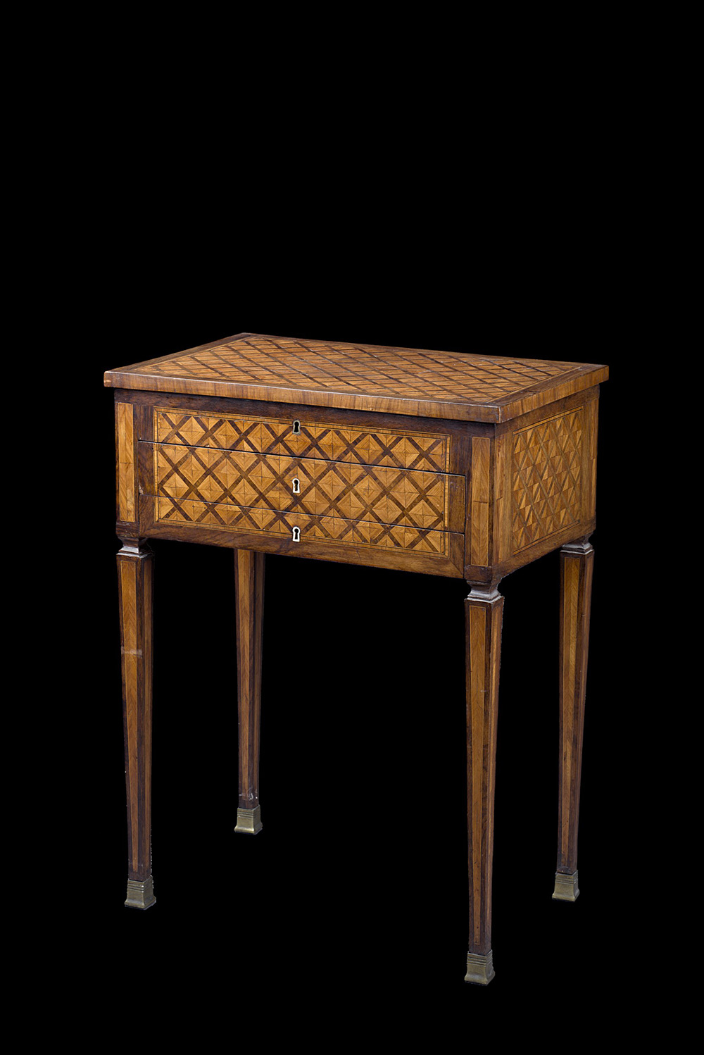 Tavolino da lavoro intarsiato a marqueterie a motivi geometrici. Piano...