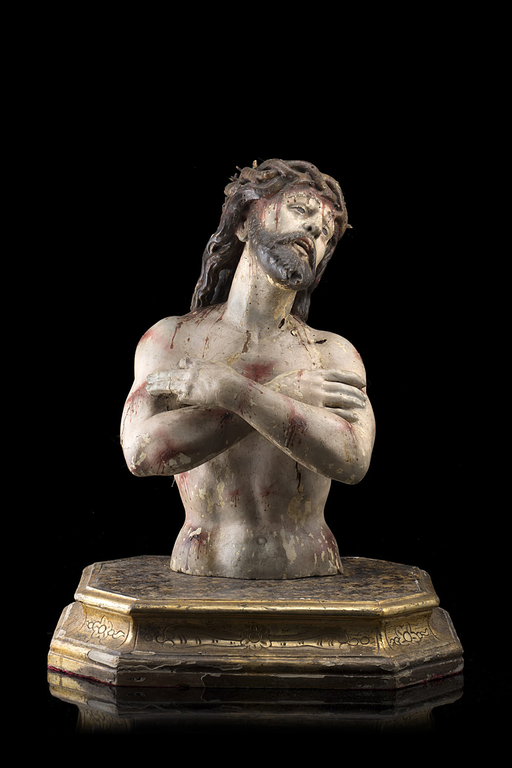 Arte del secolo XIX "Ecce Homo" scultura in legno decorato in policromia (h. cm 40) poggiante su base ottagonale in legno dorato (difetti)
