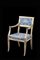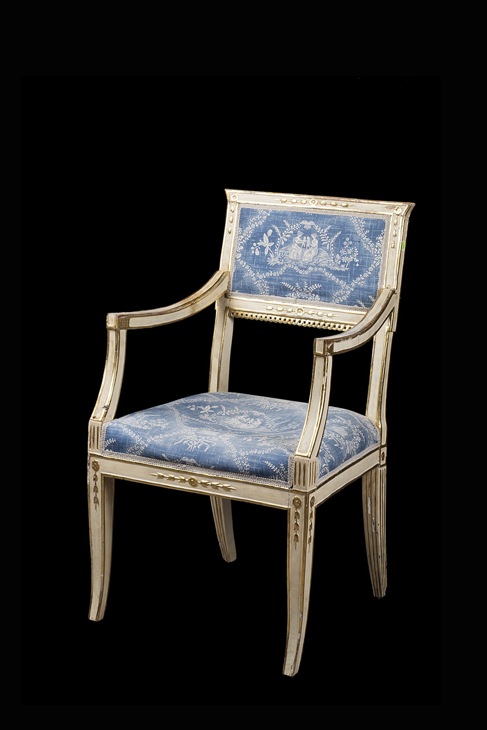 Poltrona in legno laccato e dorato decorata a greche e motivi concatenati. Gambe mosse decorate a motivi vegetali all'attacco. Napoli, secolo XVIII (difetti)