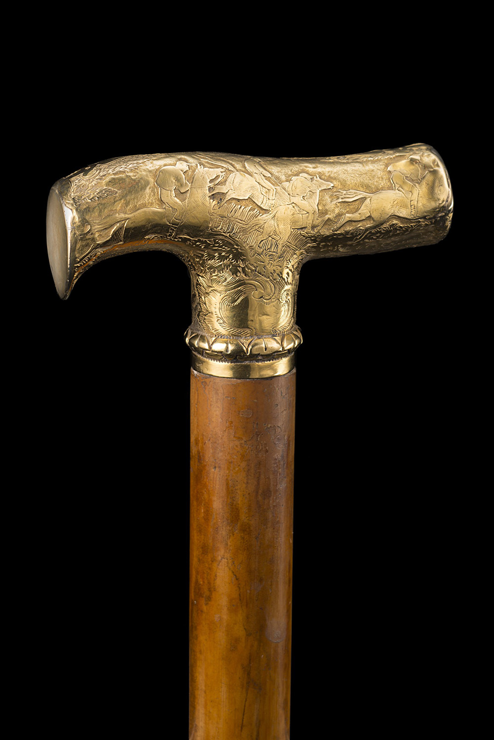 Bastone con presa in oro cesellato e inciso con scena di caccia alla volpe....