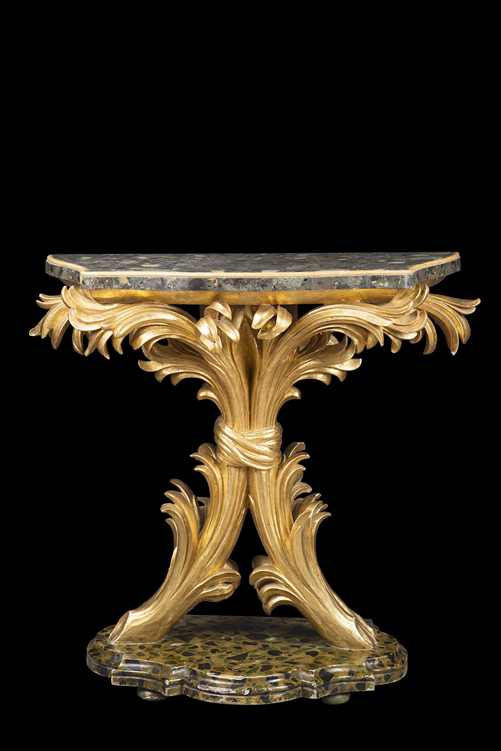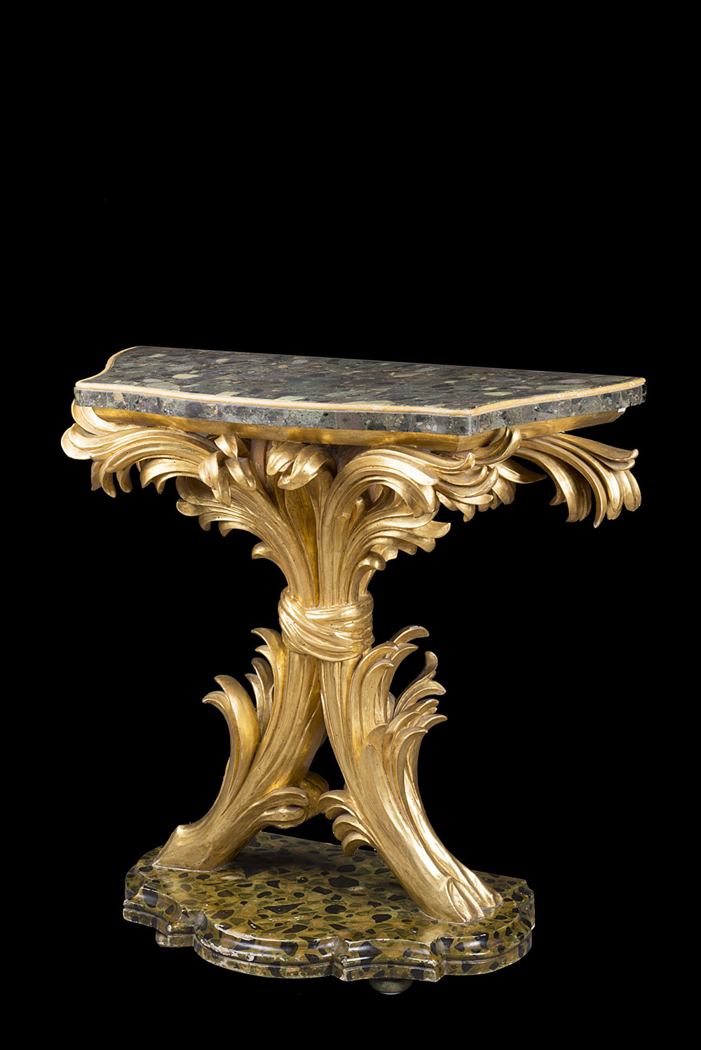 Consolle in legno dorato e intagliato a volute. Base laccata a finto marmo. Piano sagomato lastronato in marmo con ciglio in marmo giallo di Siena (cm 93x31x43) (mobile costruito con elementi antichi)