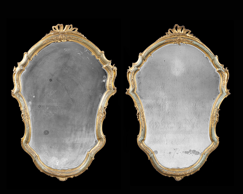 Coppia di specchiere di forma sagomata in legno intagliato e dorato con profilo interno laccato. Cimasa traforata. Veneto, secolo XVIII (cm 114x70)