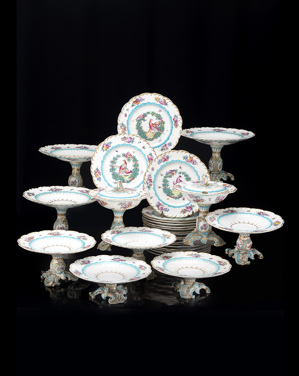 Manifattura francese, secolo XIX. Parte di servizio di piatti in terraglia, composto da: diciannove piatti piani dipinti a volatili nel cavetto e nella bordura a fiori; otto alzate di misure diverse e due zuppierine con coperchi (difetti e restauri)