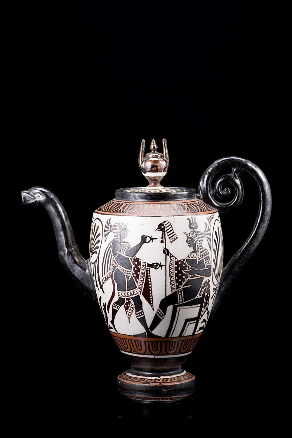 Manifattura Giustiniani, Napoli, secolo XIX. Caffettiera in terraglia con manico a voluta vegetale e beccuccio versatore a grifone in nero. Decorazione 'alla maniera dell'antico Egitto 'con figure in nero e rosso su fondo bianco avorio. Fasce a racemi vegetali stilizzati (h. cm 26) (lievi difetti)