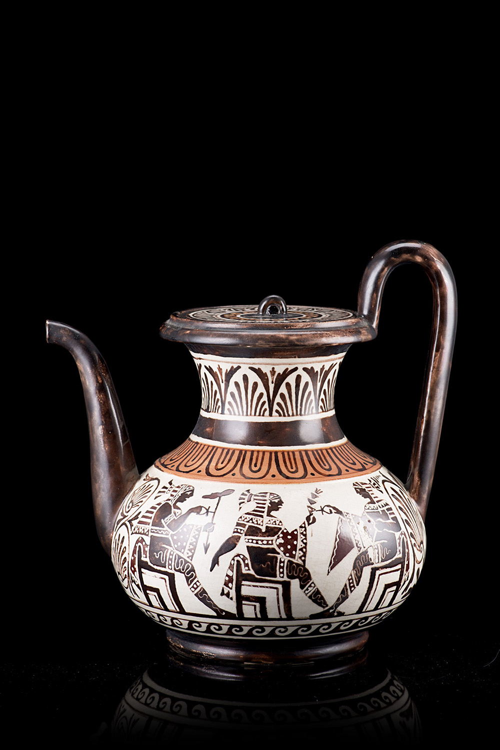 Manifattura Giustiniani, Napoli, secolo XIX. Caffettiera in terraglia con lungo beccuccio versatore con decoro 'alla maniera dell'antico Egitto' di ispirazione archeologica. Coperchio, tondo e piatto, con pomolo ad anello (h. cm 22) (sbeccature)