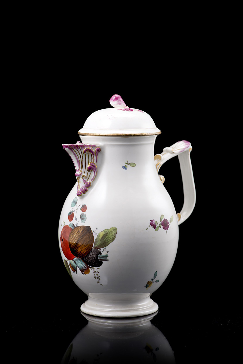 Manifattura di Ansbach, Germania, secolo XIX. Caffettiera in porcellana decorata in policromia a frutta e piccoli fiori sparsi. Manico 'a osso'e beccuccio versatore scanalato di forma rocaille in porpora e profilati in oro. Pomolo del coperchio a forma di pera. Marca di fabbrica in blu sotto vernice (h. cm 17) (difetti)
