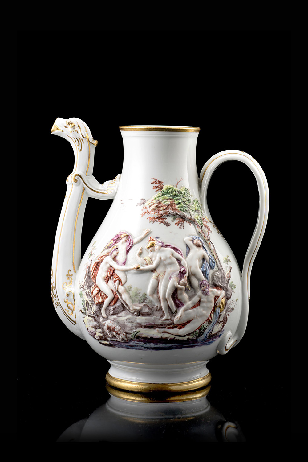 Manifattura Ginori, Doccia, secolo XVIII. Caffettiera in porcellana policroma decorata a bassorilievo con scene mitologiche, profili in oro, beccuccio zoomorfo (h. cm 20) (mancante del coperchio, usure alle dorature) Il decoro a bassorilievo istoriato, ispirato alle Metamorfosi di Ovidio, è tratto da placchette cinquecentesche, di cui si conservano le formelle originali in bronzo nel Museo delle porcellane di Doccia. Una placchetta in porcellana di questo tipo è firmata dall'Anreiter
