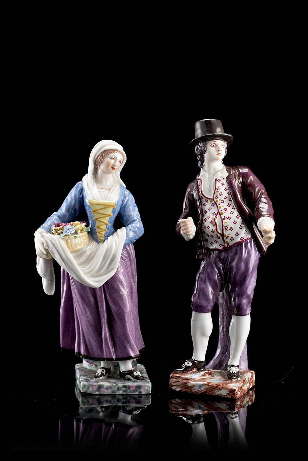 Manifattura Ginori, Doccia, secolo XVIII. Due statuine in porcellana policroma raffiguranti una venditrice di fiori e una figura maschile con cilindro. Basi squadrate (h. cm 13 circa) (lievi restauri e mancanze) Le due piccole plastiche fanno parte delle numerose serie di figure da tavola nel gusto tardo rococò di gran moda in tutta Europa e che conobbero diverse edizioni. Il periodo di produzione è quello della gestione di Lorenzo Ginori fra il 1758 ed il 1791. Sotto alle basi, etichetta di provenienza 'Sandro Orsi - Antichità - Via Bagutta 14 - Milano' con numeri di collezione '81' e '83'.