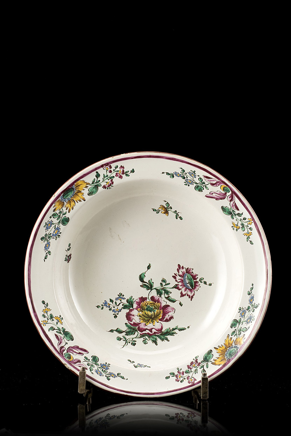 Manifattura di Felice Clerici o Pasquale Rubati, Milano 1770/80. Scodella tonda in maiolica con colori a smalto. Orlo liscio con profilo in rosso. Decorazione 'ad uso di Strasburgo' con rose, margherite e tulipani (d. cm 25 ca.) (piccola sbeccatura all'orlo e puntinature allo smalto)