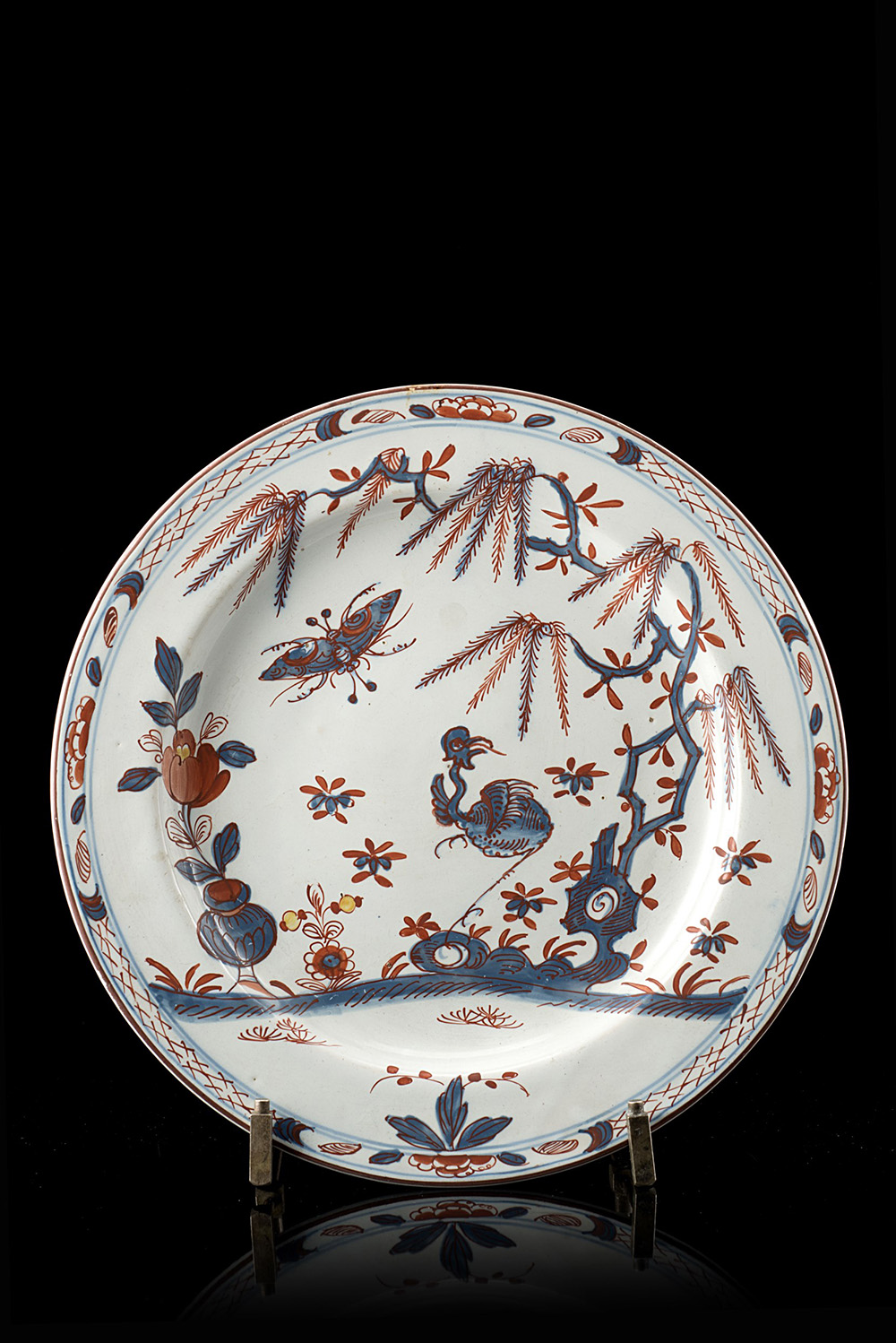Manifattura di Felice Clerici e Pasquale Rubati, Milano, 1760/80.Piatto tondo in maiolica con decorazione di derivazione orientale, in rosso e blu 'allo struzzo' con trampoliere sotto un salice, vaso con fiore di loto e farfalla. Bordo liscio dipinto con una fascia a nastro con linee intrecciate e riserve con fiori (d. cm 23)