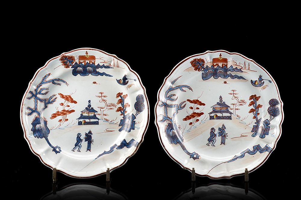 Manifattura di Felice Clerici e Pasquale Rubati, Milano 1745/80. Due piatti polilobati in maiolica con bordi profilati in rosso bruno con decorazione "alla pagoda o "al carabiniere"(d. cm 23,5) (puntinature allo smalto)