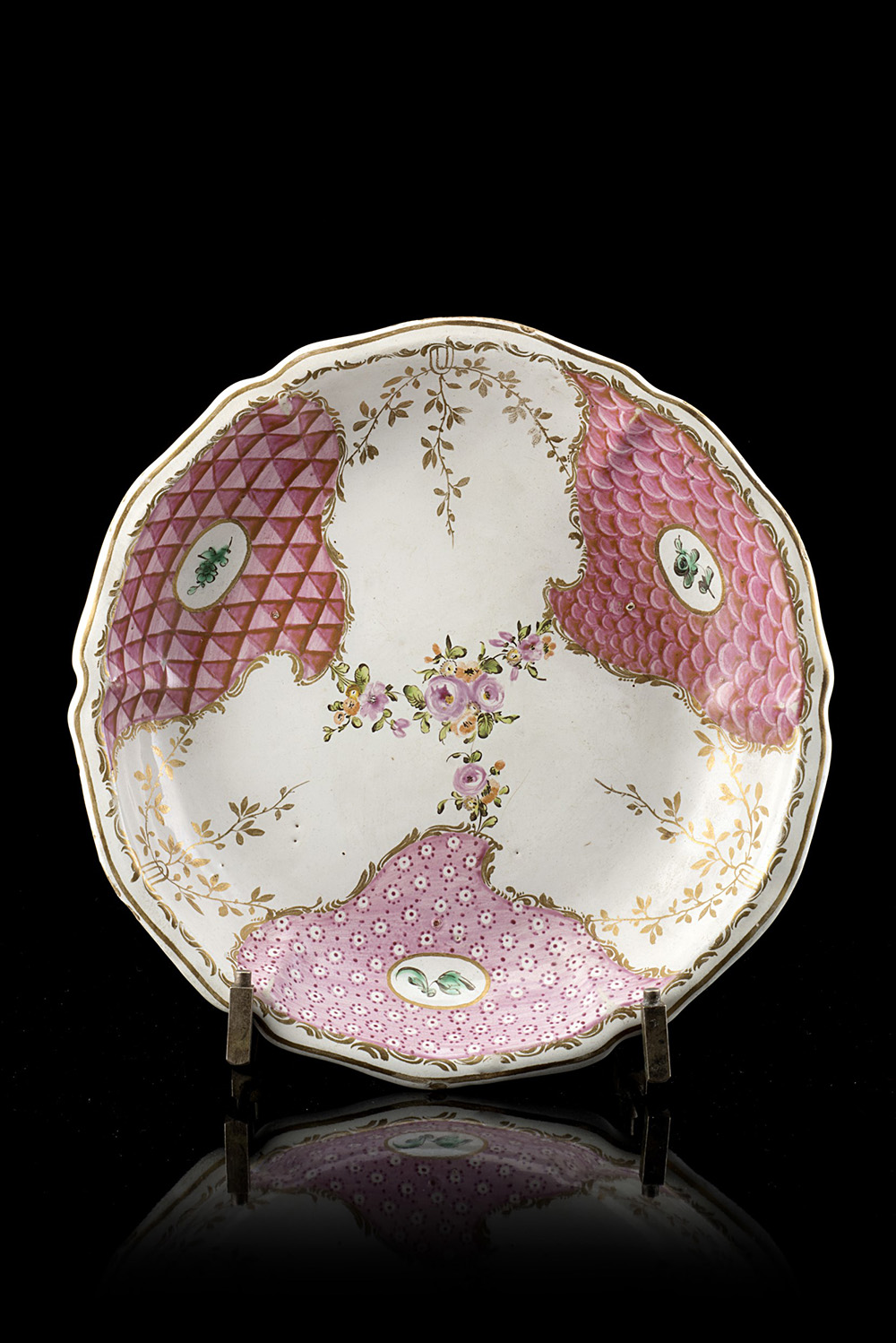 Manifattura di Pasquale Rubati, Milano, 1770/90. Piccolo piatto a bordo leggermente rilevato e cavetto piano in maiolica policroma, decorazione a settori 'alla porcellana' in diverse gradazioni di rosa con motivi a triangoli, ad occhio di pernice, a griglia e a tegole con al centro mazzo di piccoli fiori. Al profilo del bordo e delle riserve corre un motivo a festone in oro. Sul retro, pennellata in bruno (d. cm 20,5) (lievi sbeccature)Per confronti si veda: scheda n. 383 a cura di R. Ausenda in Musei e Gallerie di Milano - Museo d'Arti Applicate Ceramiche, Tomo II, Electa 2001