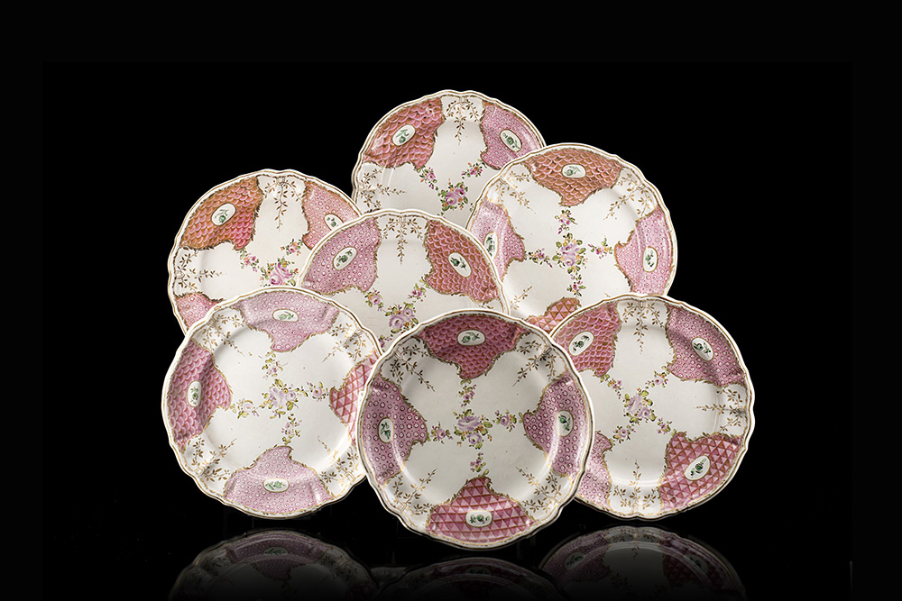 Manifattura di Pasquale Rubati, Milano, 1770/90. Sette piatti mistilinei a bordo leggermente rilevato e cavetto piano in maiolica policroma, decorazione a settori 'alla porcellana' in diverse gradazioni di rosa con motivi a triangoli, ad occhio di pernice, a griglia e a tegole con al centro mazzo di piccoli fiori. Al profilo del bordo e delle riserve corre un motivo a festone in oro. Sul retro, pennellata in bruno (d. cm 23,5)Per confronti si veda: scheda n. 383 a cura di R. Ausenda in Musei e Gallerie di Milano - Museo d'Arti Applicate Ceramiche, Tomo II, Electa 2001