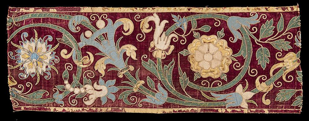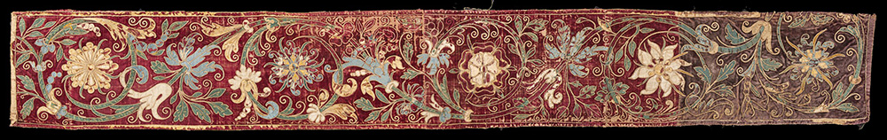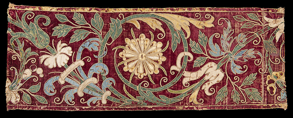 Decorazione alla "raffaellesca" con applicazioni di seta in vari colori profilati da un cordoncino ricoperto di filo d'argento a formare volute ricurve su se stesse che racchiudono ciascuna un fiore.(cm 250x34; 250x34; 90x34 e 90x34) (difetti e mancanze)